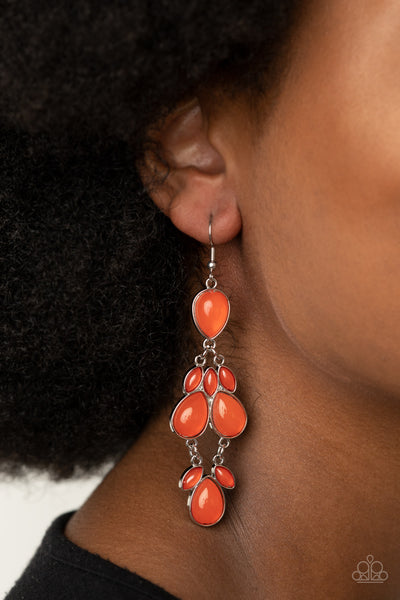 Encased in sleek silver fittings, a glassy collection of marquise and teardrop Amberglow beads delicately connect into a dramatically colorful lure. Earring attaches to a standard fishhook fitting.