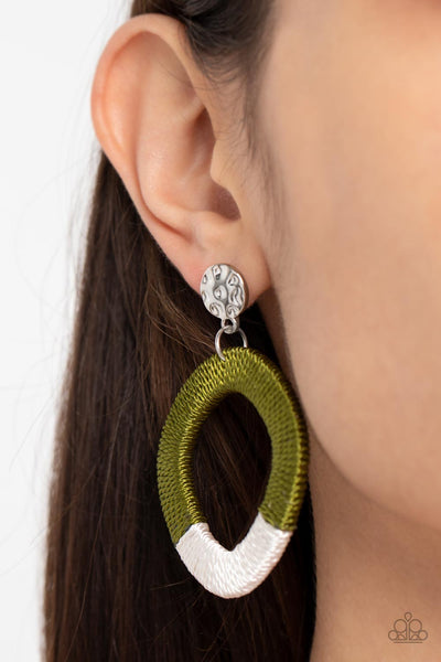 A hammered silver disc gives way to a wooden frame decoratively wrapped in shiny white and Olive Branch threaded accents, creating a colorful lure. Earring attaches to a standard post fitting.