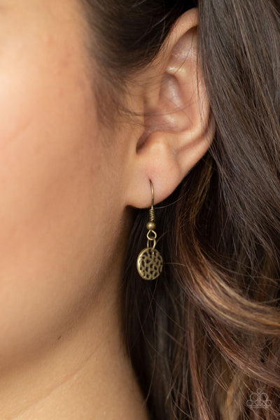 Featuring a warped finish, a trio of hammered and studded brass frames are bordered in silver as they link below the collar for a striking industrial statement. Features an adjustable clasp closure.