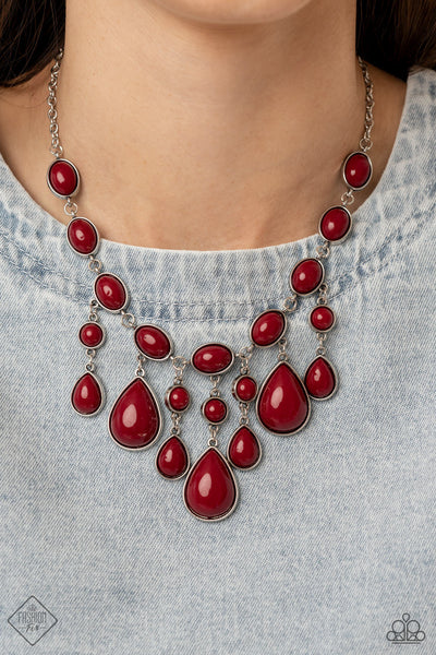A row of deep red oval beads set in antiqued silver frames connect end to end across the collar. Falling from the center of the design, a trio of opulently grand teardrop beads coalesce with streams of smaller red round and teardrop beads creating a flirty fringe and dramatic allure. Features an adjustable clasp closure.