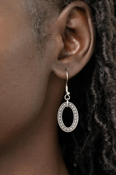 Featuring a colorful multicolored terrazzo finish, a faceted purple faux stone swings from a row of studded silver rings, flat silver hoops, and oversized silver fittings, creating an earthy pendant below the collar. Features an adjustable clasp closure.